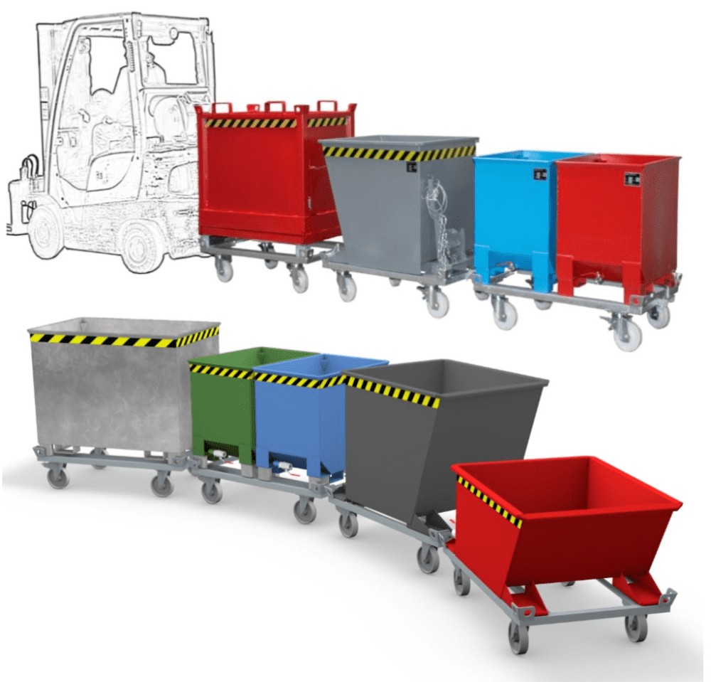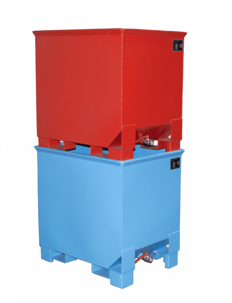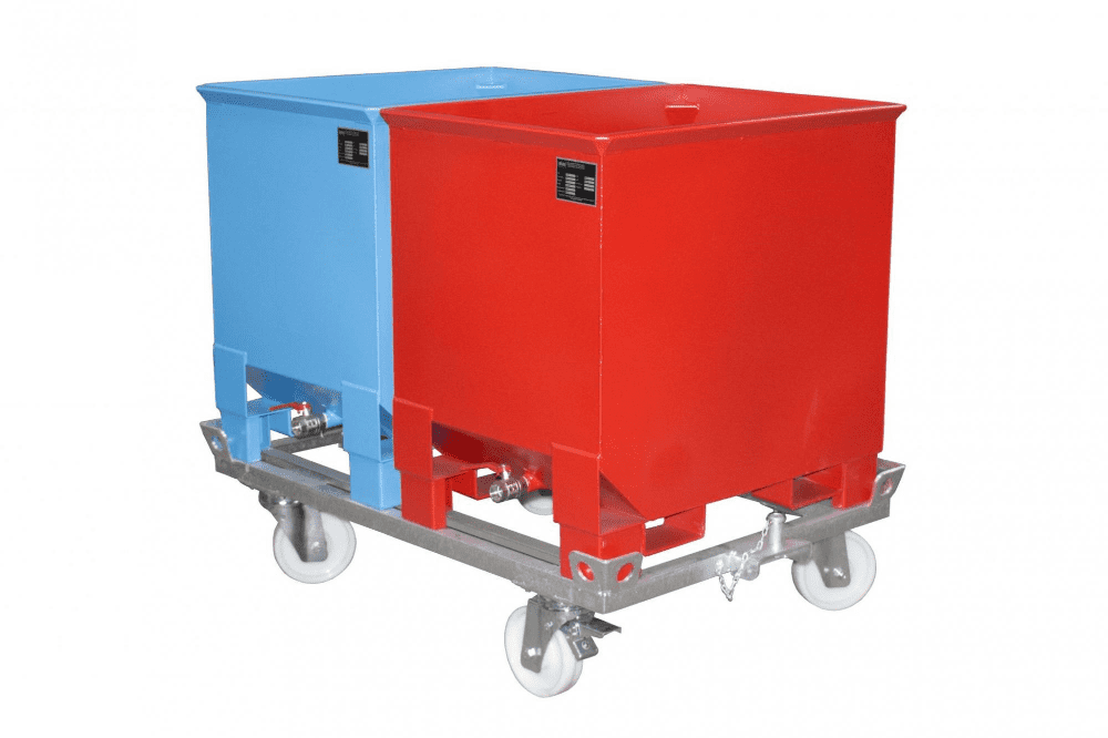 Swarf bins suitable for use with tugger train systems, manufactured from steel, fully welded, oil and watertight. Units have smooth inner walls, a perforated sieve and a 1" drain-cock for easy fluid separation.